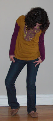 These colors seem warm and springy to me, and I just feel comfortable and cheery in this ensemble. This is sort of my take on the split complementary idea from academichic, but I'm only really incorporating 2/3 of the colors, so it probably doesn't count. Only downfall? I hate wearing jeans the day after they are washed...so tight!
